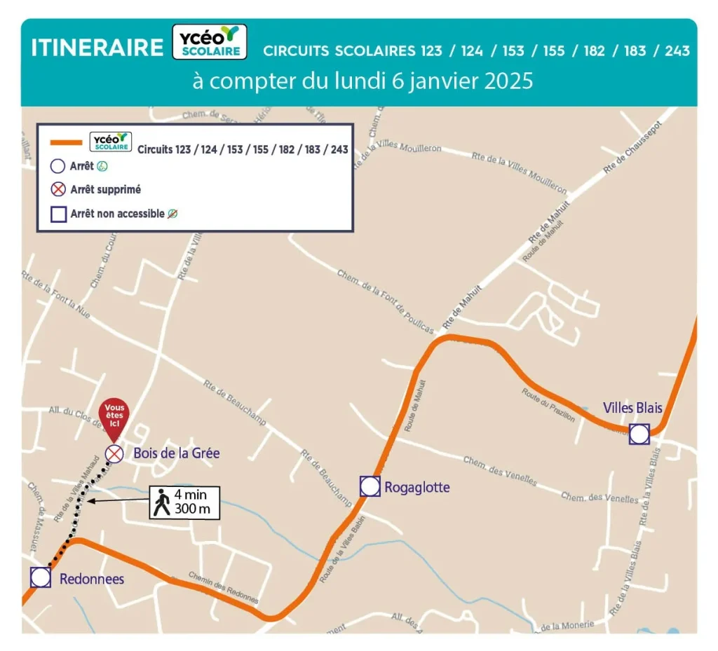 • L’arrêt Bois de la Grée ne sera pas desservi (dans les deux sens) et sera reporté à l’arrêt Redonnees (non accessible PMR)