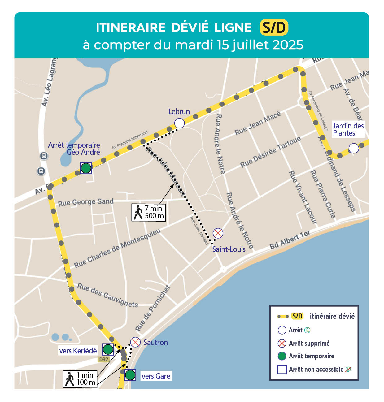 - L’arrêt Saint-Louis n’est pas desservi (dans les 2 sens) et est reporté à l’arrêt Lebrun (accessible PMR)