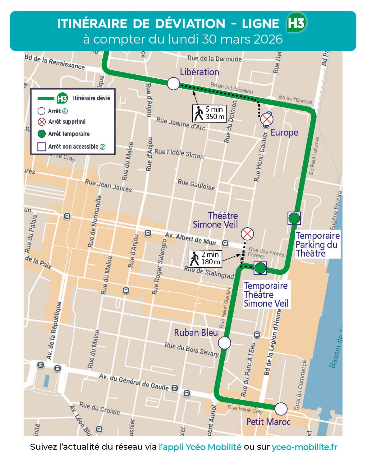 - L’arrêt Théâtre Simone Veil ne sera pas desservi (dans les 2 sens) et sera reporté à l’arrêt temporaire Théâtre Simone Veil situé rue des Frères Pereire (non accessible PMR)
