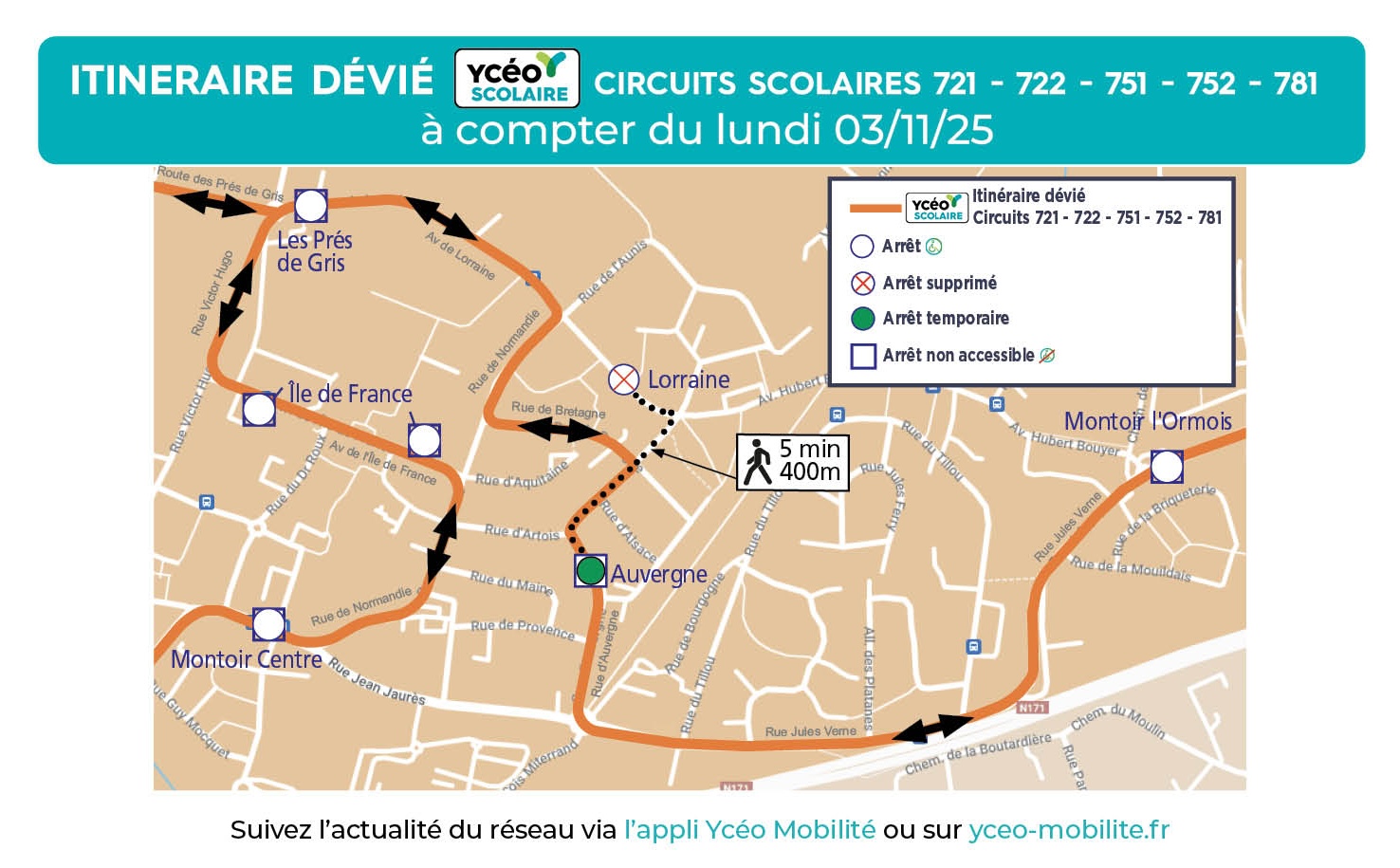 • Circuits scolaires 721 – 722 – 751 – 752 – 781 : l’arrêt Lorraine ne sera pas desservi (dans les 2 sens) et sera reporté à l’arrêt temporaire Auvergne (non accessible PMR)