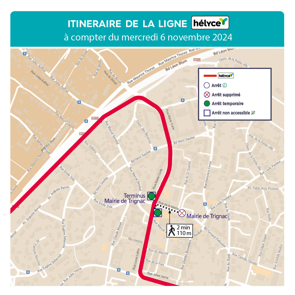 L’arrêt Mairie de Trignac (vers Saint-Nazaire) ne sera pas desservi et reporté à un arrêt temporaire (non accessible PMR) situé rue Louis Labro côté centre commercial G20.