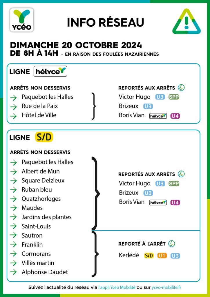Les arrêts Paquebot les Halles, Rue de la Paix, et Hôtel de Ville ne seront pas desservis (dans les 2 sens) et seront reportés aux arrêts Victor Hugo, Brizeux, et Boris Vian (accessibles PMR).