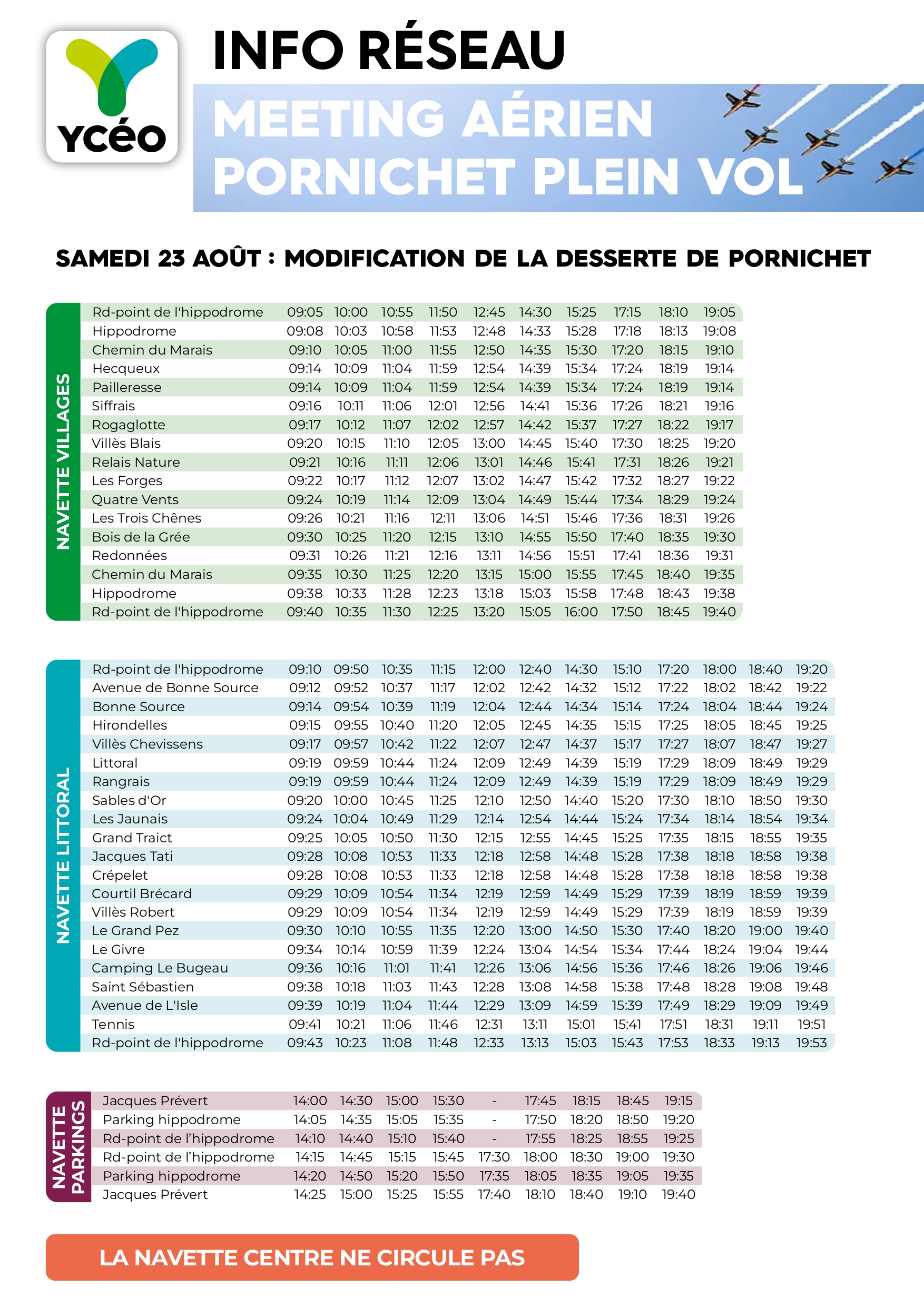 - Navette villages : course de 16h20 supprimée, l’arrêt Marché de Pornichet ne sera pas desservi, et une course à 19h05 sera ajoutée