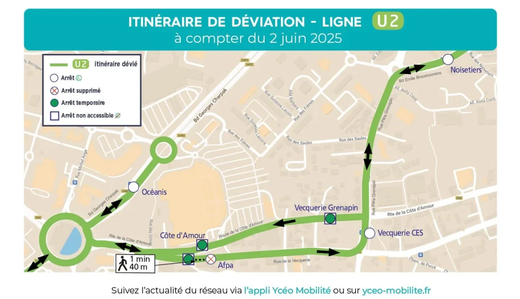 - Les arrêts Côte d’Amour et Océanis 2 ne seront pas desservis (vers le Grand Pez) et seront reportés à l’arrêt Océanis (accessible PMR)