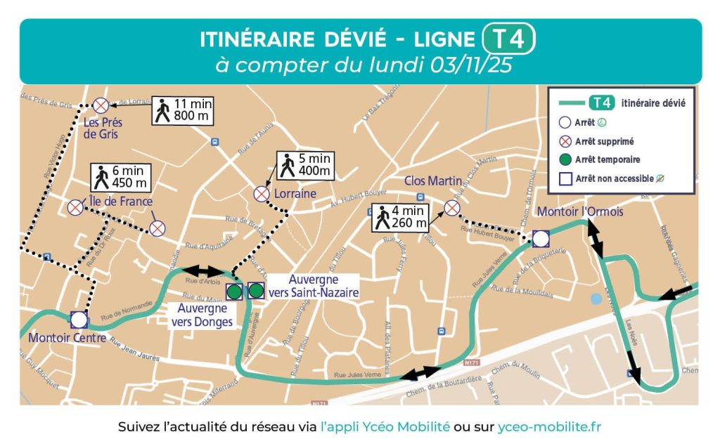 - Les arrêts Île de France et Les Prés de Gris ne seront toujours pas desservis (dans les 2 sens) et seront reportés à l’arrêt Montoir Centre (non accessible PMR)