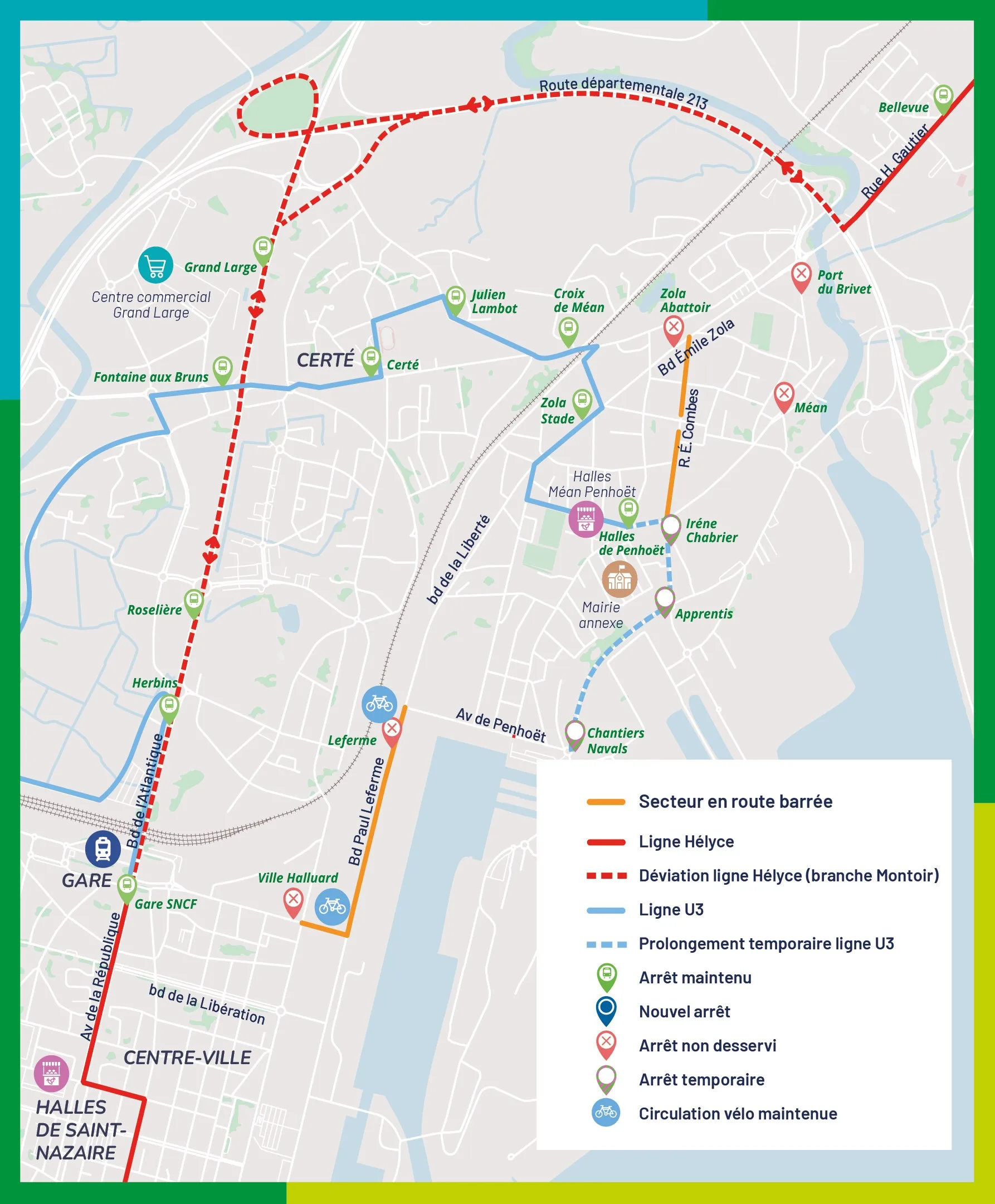 • Arrêt Ville Halluard : reporté à l’arrêt Gare de St Nazaire (ligne hélyce).