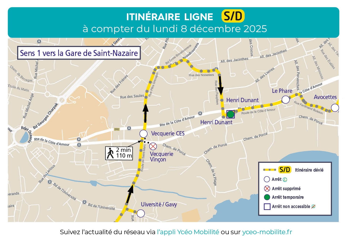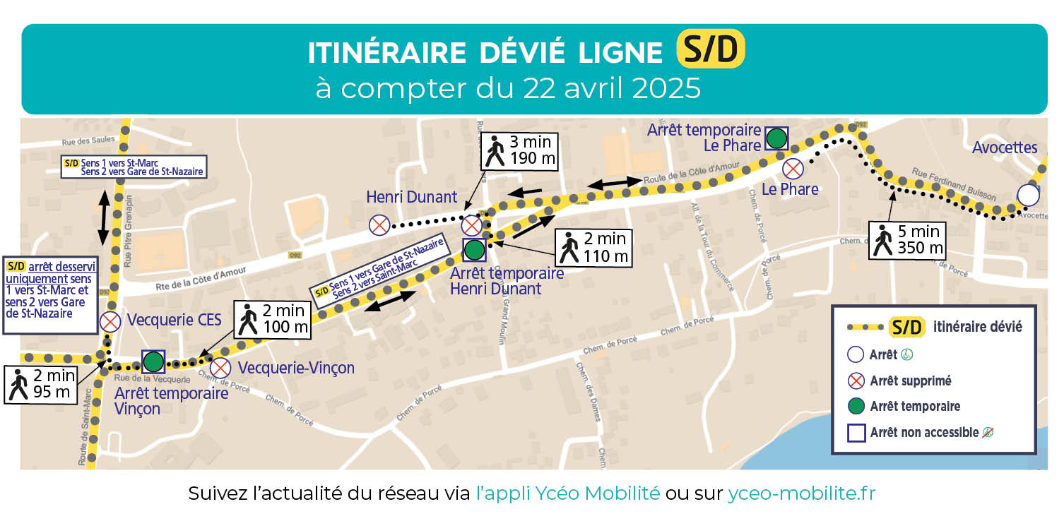 - L’arrêt Vecquerie Vinçon ne sera pas desservi (sens 1 vers la Gare de Saint-Nazaire) et sera reporté à l’arrêt Vecquerie CES (accessible PMR)